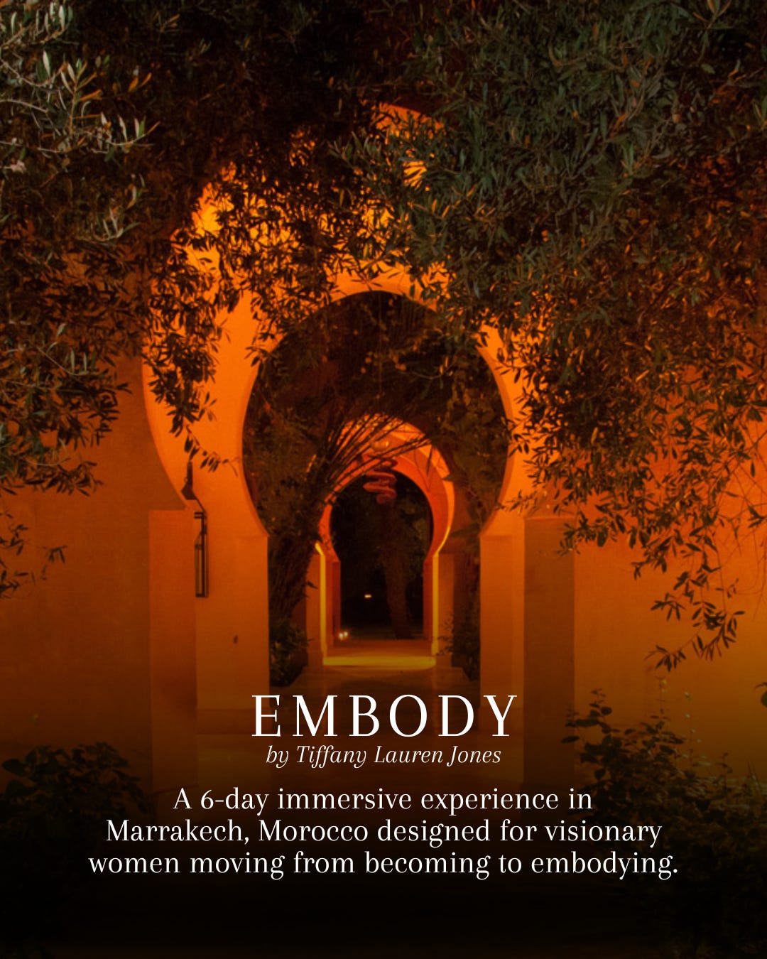 Hosted at the intimate Jnane Tamsna—a black, woman owned Michelin-guide art and culture boutique estate in Marrakesh—led by me, EMBODY brings together women stepping into a new era of self-led life and business, women who know something is shifting, and are ready to integrate clarity into lived alignment.